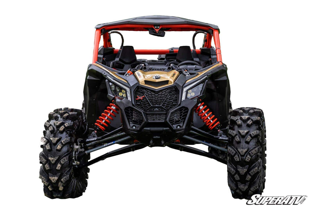 A 3" Lift Kit That Lets You Do More Taking your Can-Am Maverick X3 out for a spin results in dragging your skid plate across lots of logs and rocks. Save your undercarriage and tackle more difficult trails with a 3" Lift Kit from SuperATV. It measures true to size, so you get three more inches of ground clearance and enough tire clearance for up to 29.5" tires on 64" models and up to 32" tires on 72" models. Ride hard and ride higher your lifted Maverick X3 lets you do more.