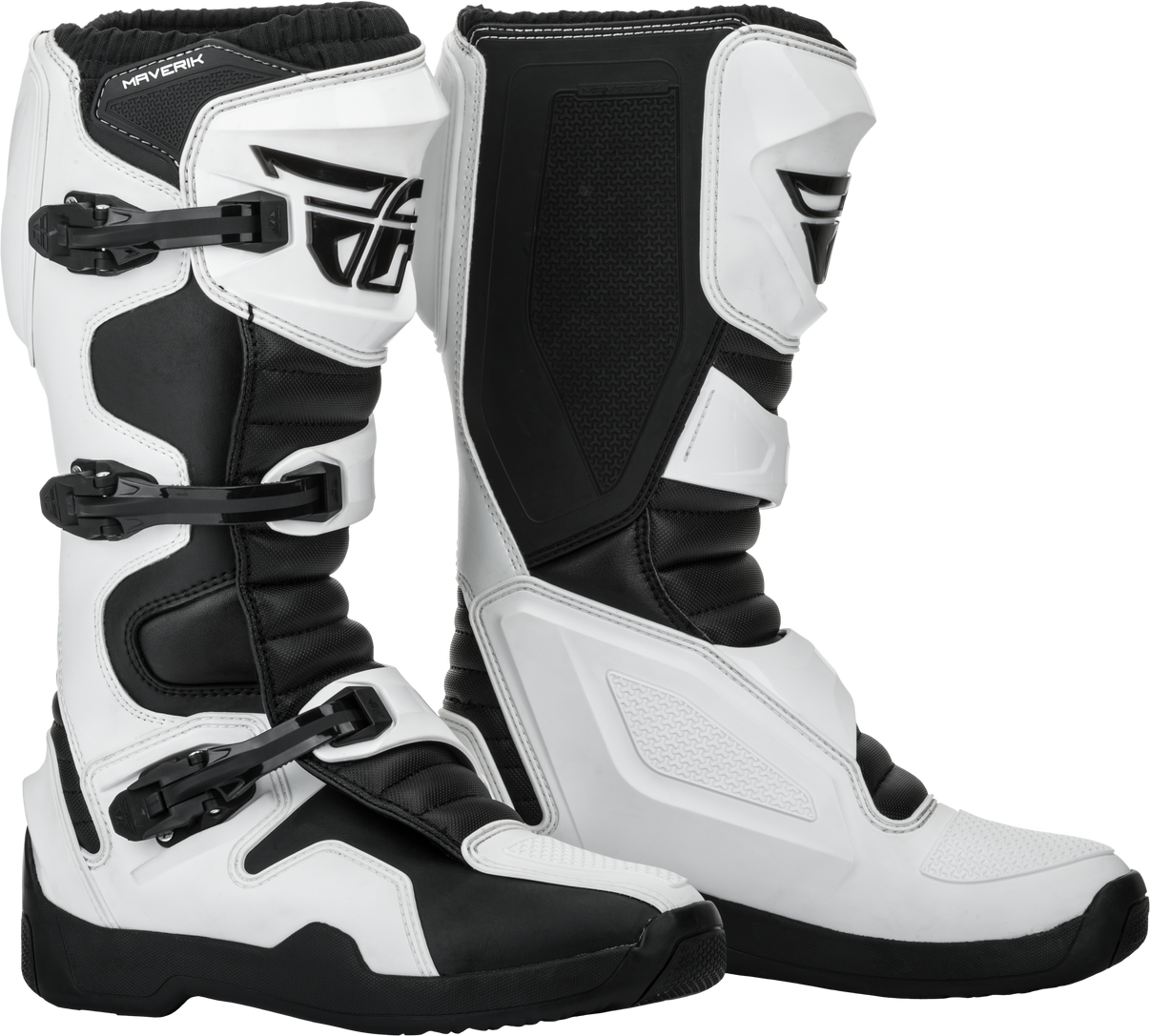 Experience superior performance with the FLY RACING Maverik Boots in White/Black, size 14. Designed for durability and comfort, these boots feature a 3D molded plastic shift panel that enhances shifting precision while protecting the boot from wear. The articulated rear ankle provides flexibility without sacrificing support, making them perfect for any rider. CE approved and equipped with a molded outsole for style and lightweight comfort, these boots are built to withstand the rigors of off-road riding.