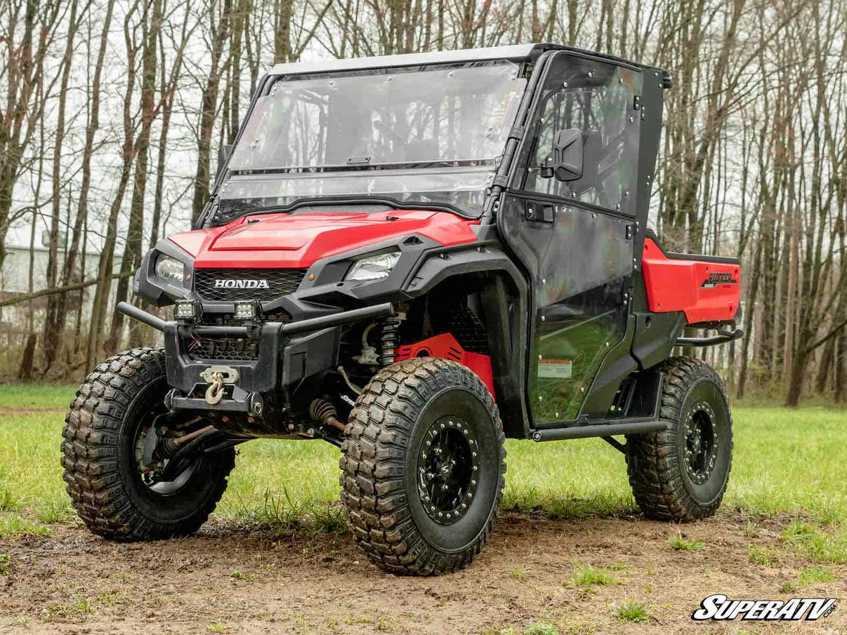Year-Round Riding Your Honda Pioneer is one capable machine that can take on everything that trail throws at you. But is it prepared for Mother Nature too Take your rig to the next level by adding SuperATV's Honda Pioneer 1000 Convertible Cab Enclosure Doors. With little effort, you can transform them from full doors to half doors. You'll be able to keep up with your work without worrying about the weather. They're made from lightly-tinted polycarbonate material so that you can stay protected from all the elements on the trail. These doors are one-of-a-kind, featuring our two-piece design and loaded with features.