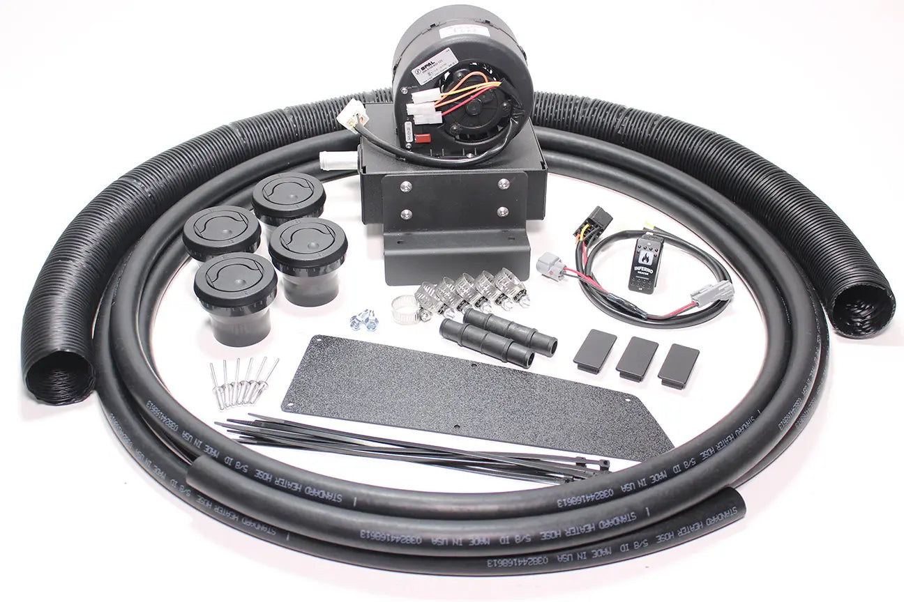 Includes all necessary components: heater hose, hose splicers, hose clamps, mounting brackets, defrost and floor louvers, ductwork & wiring.