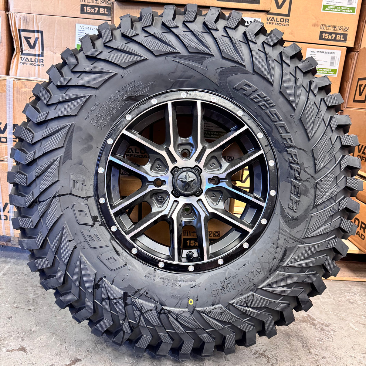 Get a set of (4) MSA Fang wheels  mounted on 8 ply radial Obor Roc Scraper tires with vehicle specific lug nuts included