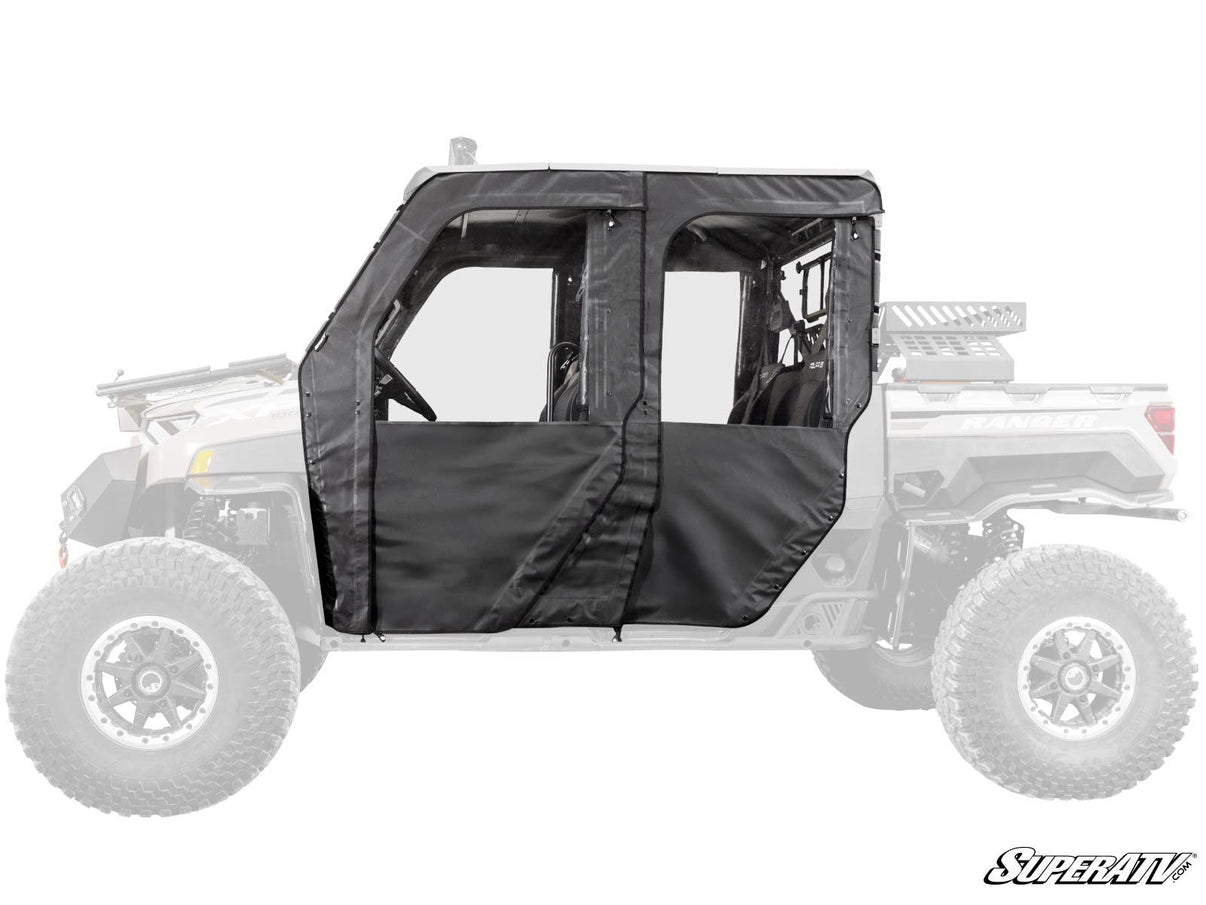 Ride Through Any Season These Polaris Ranger XP Crew soft doors are designed to let you adapt to changing conditions. So whether your early spring ride is warmer than you thought or your summer cruise gets interrupted by rain, you're ready for anything. The windows unzip and roll up to give you the perfect amount of air without compromising protection. Or you can go to a fully open cab by unzipping and removing the doors completely. Whatever the weather does, these doors can handle it.