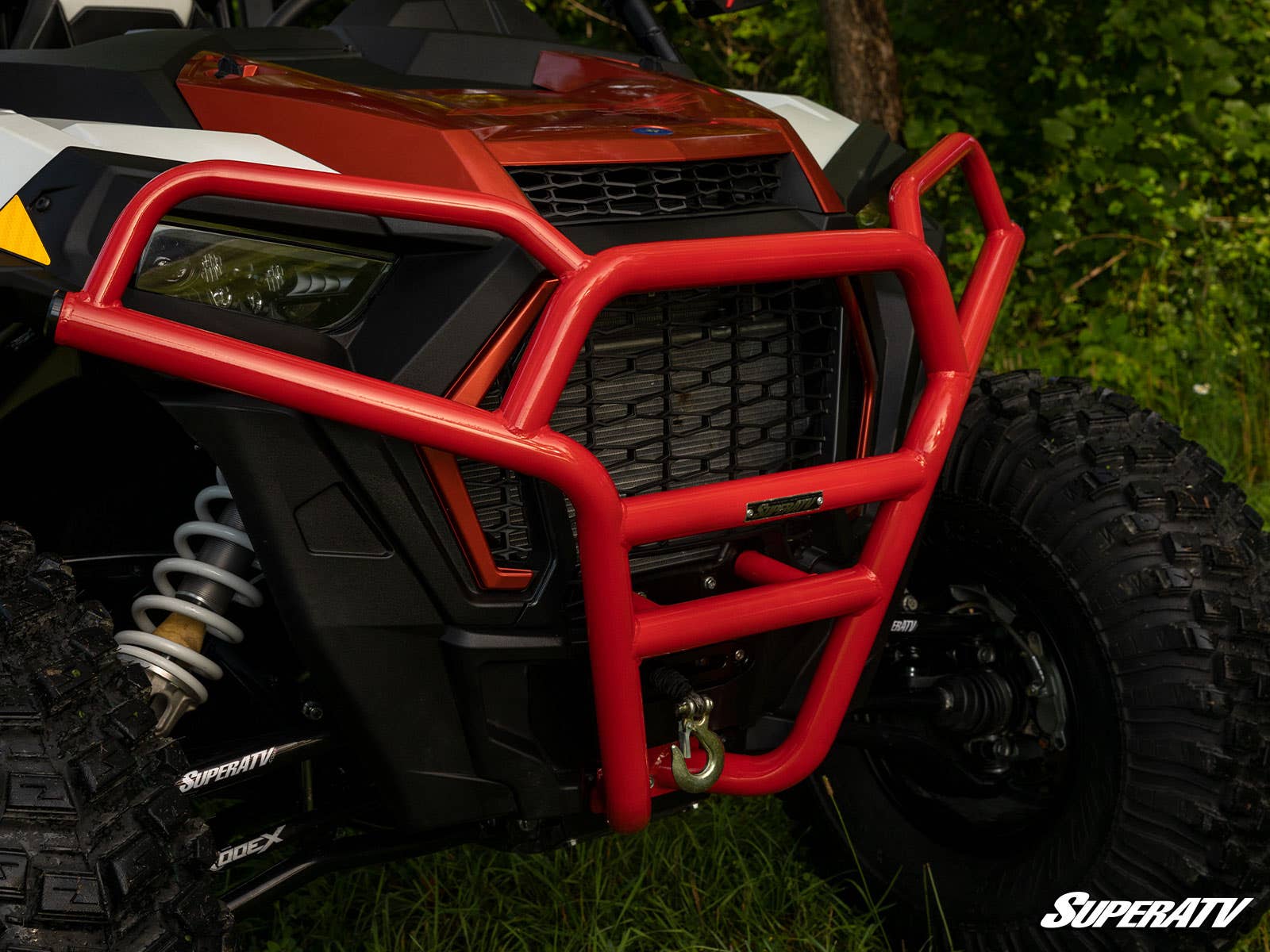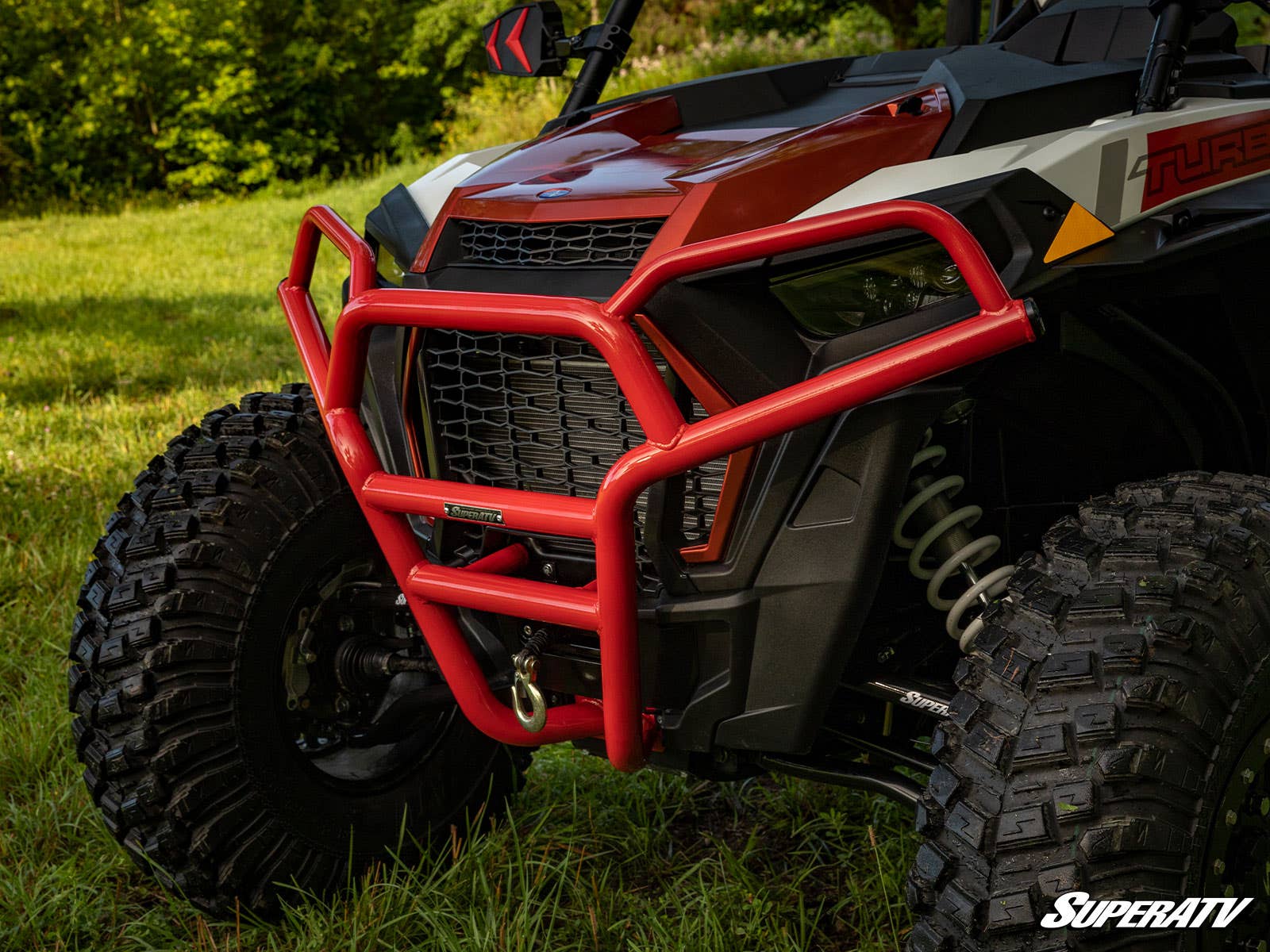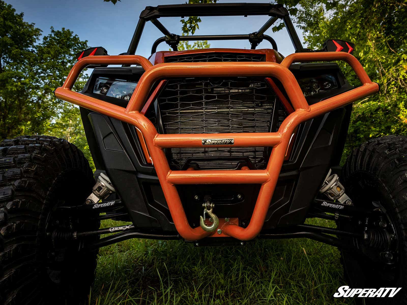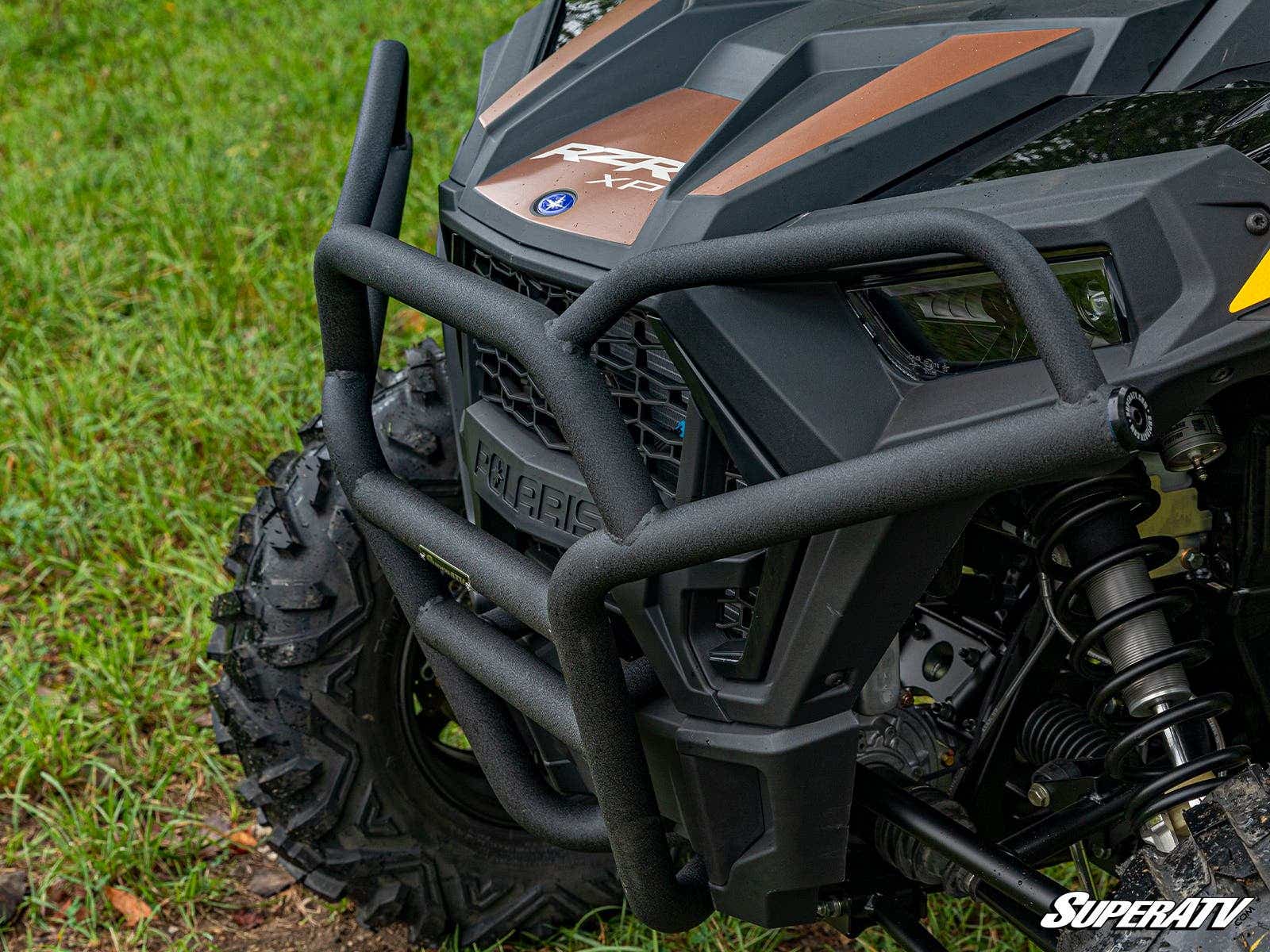 This tubed brush guard mounts directly to your RZR Trail?s frame to shield your grille, headlights, and bodywork from any obstacle. Its intelligent design and heavy-duty steel construction give you the strength and reliability you?ve come to expect from SuperATV products. We complete this bumper with a powder coat finish, which doesn?t just give it a more menacing look?it also protects the bumper from rust and UV rays, adding to the longevity of this product. Overall, you?re getting a protection piece that works harder than anything else on the market?including OEM bumpers.