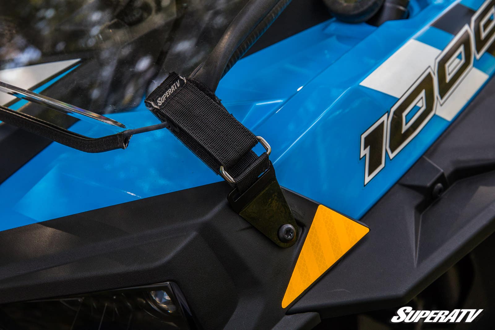Installing this machine on your RZR XP 1000 is just about as easy as can be. The hood brackets can be installed by hand and using existing mounting points, so no drilling is required. The rugged Velcro straps that hold your windshield in place are designed to withstand all weather conditions. We also made sure the folding hinge sits below your line of sight, so no matter which position the windshield is in, you'll never have to worry about your view being obstructed. Each SuperATV windshield is cut to match your machine's curves perfectly, so it won't rattle, won't slip, and will always look great.