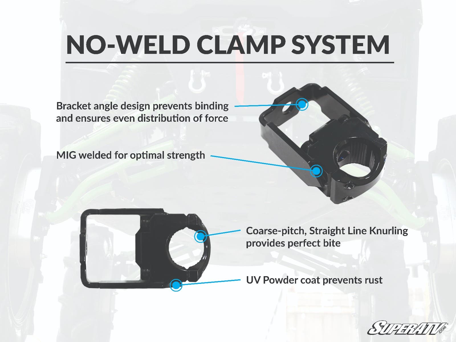 We know what we're doing and we know the difference between track bars that rock and track bars that suck. Ours rock. Our clamps are big and beefy our tests show that they won't break when properly installed so there's no need to weld. And even though they're big, our clamps only hang down a couple inches to minimize clearance loss.