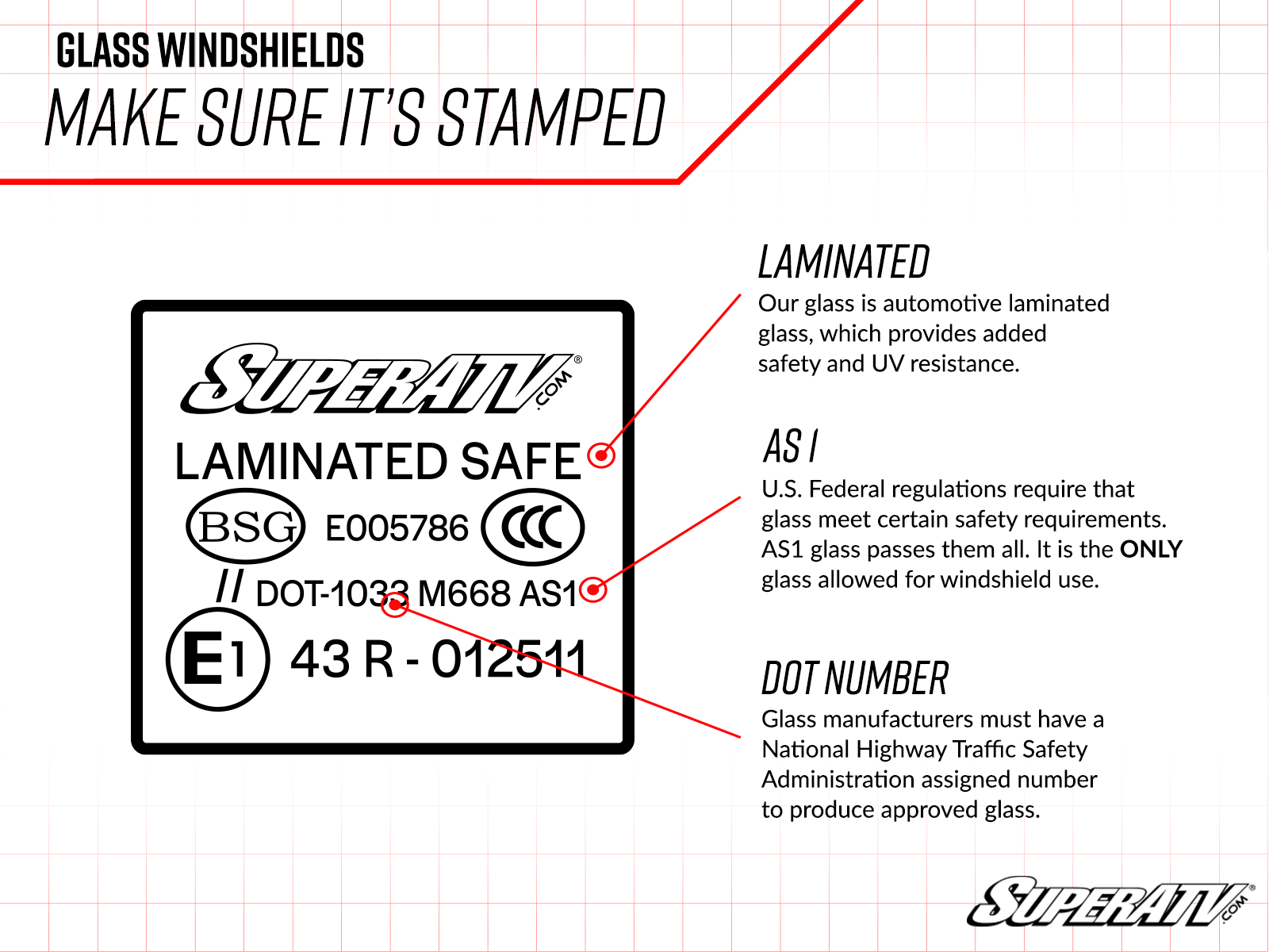 More Comfort The work has to get done whether your cab is comfortable or not. If you want to enjoy your time behind the wheel, keep the elements out with a glass windshield from SuperATV. With extreme scratch resistance, a wide viewing angle, and a glare-reducing tint, this windshield gives you perfect clarity on the trail. Combine that with the included manual wiper and sliding vents, and you won't find a more convenient automotive glass windshield. Not to mention, it's DOT approved and stamped so you're that much closer to being street legal**.