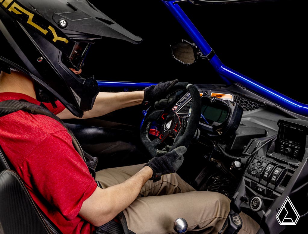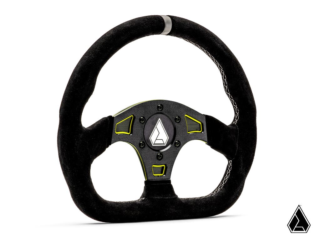 Fierce Design This steering wheel features a fierce design to match your machine. It has a CNC cut aluminum plate with the options of 5 different colored lower plates for added style. And it's finished in jet-black suede material.