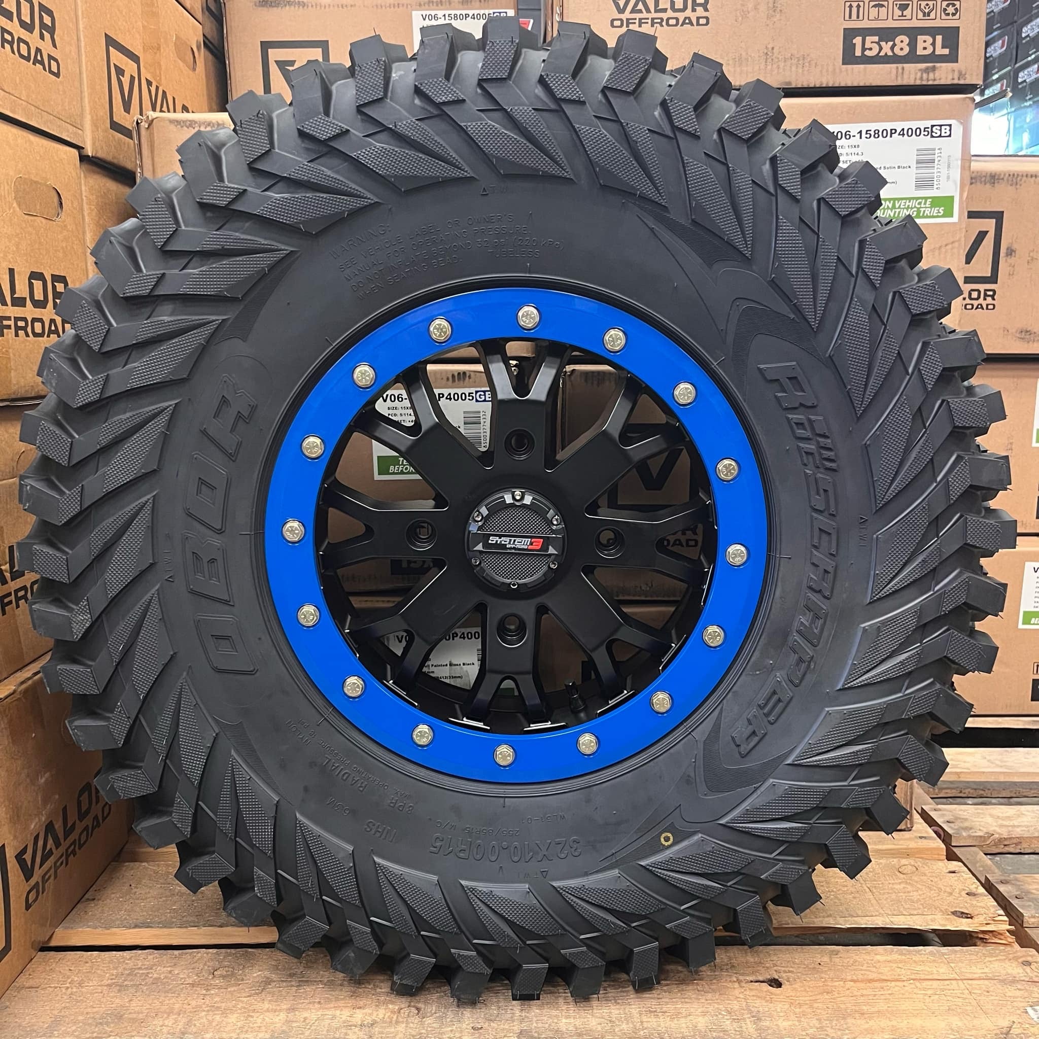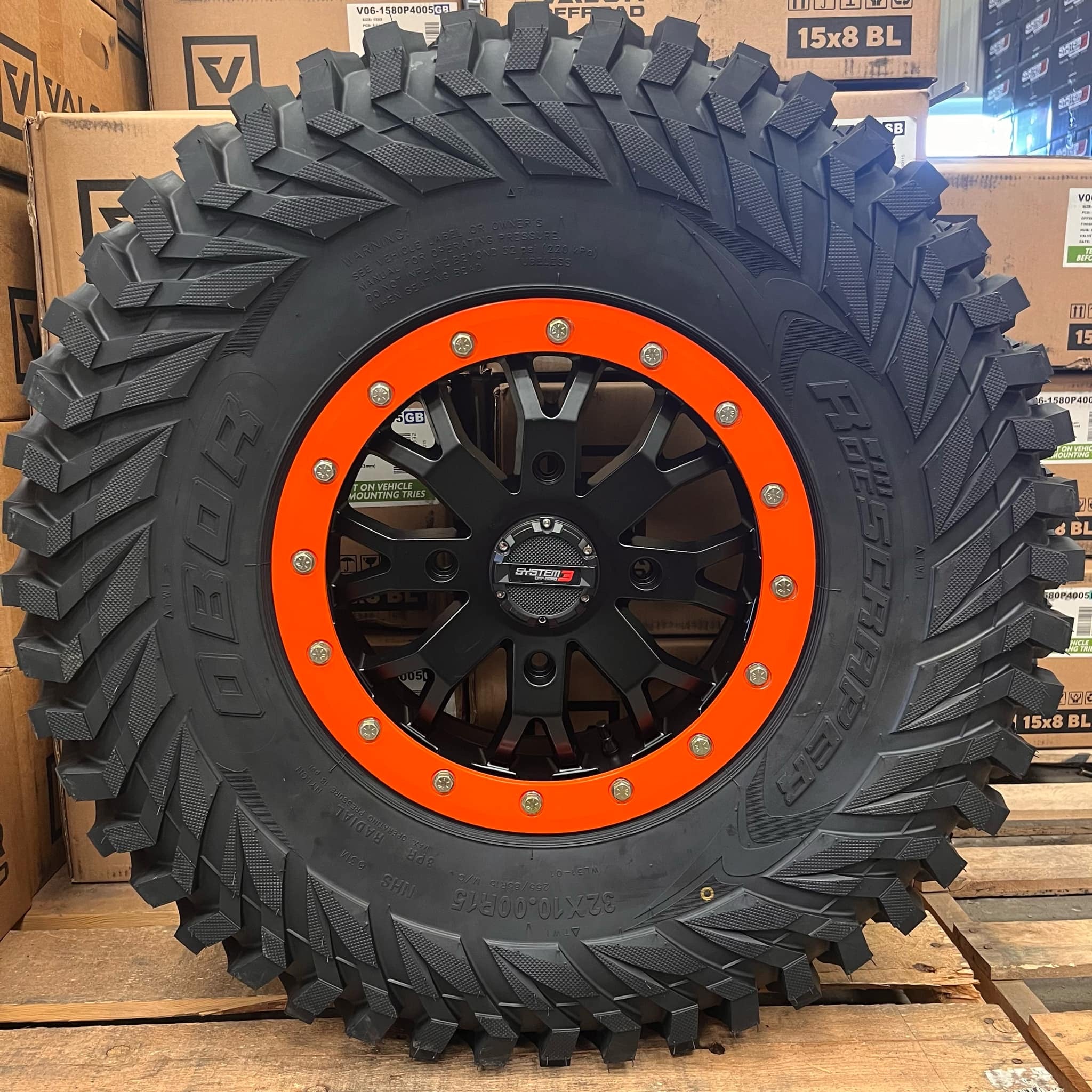 Get a set of (4) matte black System 3 SB4 beadlocks with custom colored beadlock ring mounted on 8 ply radial Obor Roc Scraper tires with vehicle specific lug nuts included
