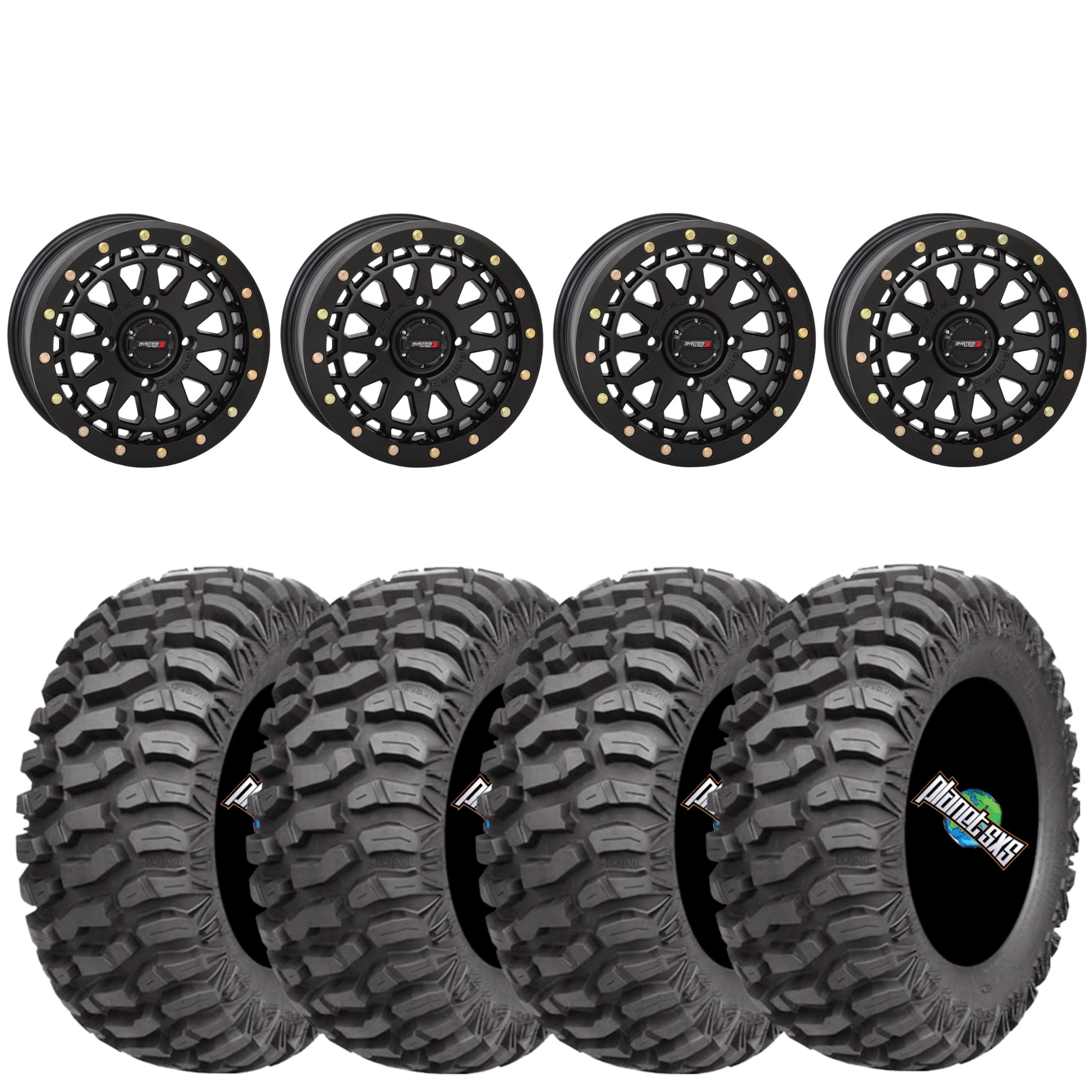 Get a set of (4) matte black System 3 SB6 beadlocks mounted on 8 ply radial AMS M1 Evil tires with vehicle specific lug nuts included