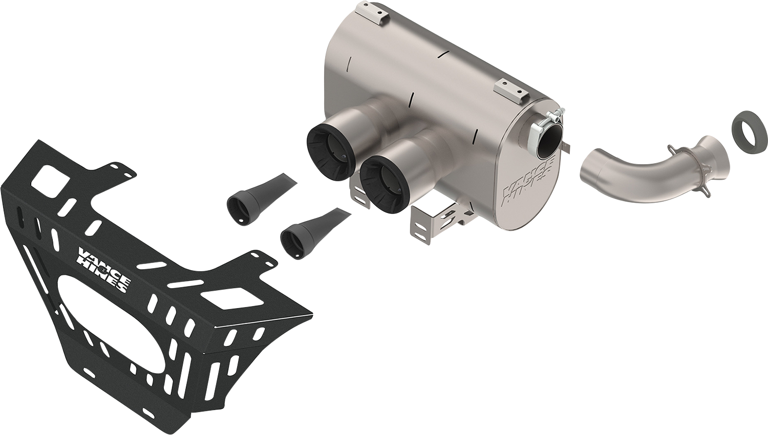 CNC machined billet end caps, 304 stainless steel construction, Deeper exhaust note, Laser-cut rear guard, 4" dual-tip center exit, Meets SAE J1287 sound standards, Includes SAE J350 compliant spark arresters, Mounts to factory down pipe, 50-State emissions compliant