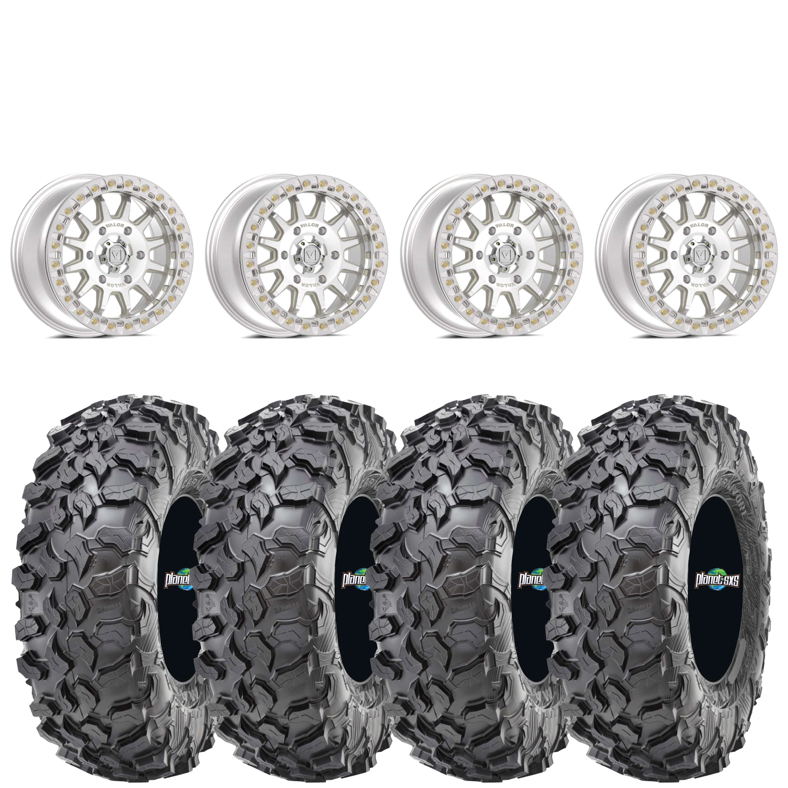 Raw beadlock style meets terrain-crushing tire performance.This pre-mounted combo features Valor Offroad V09 beadlock wheels in raw machined finish paired with Maxxis Carnivore 8-ply radial tires, giving your UTV a... Read More