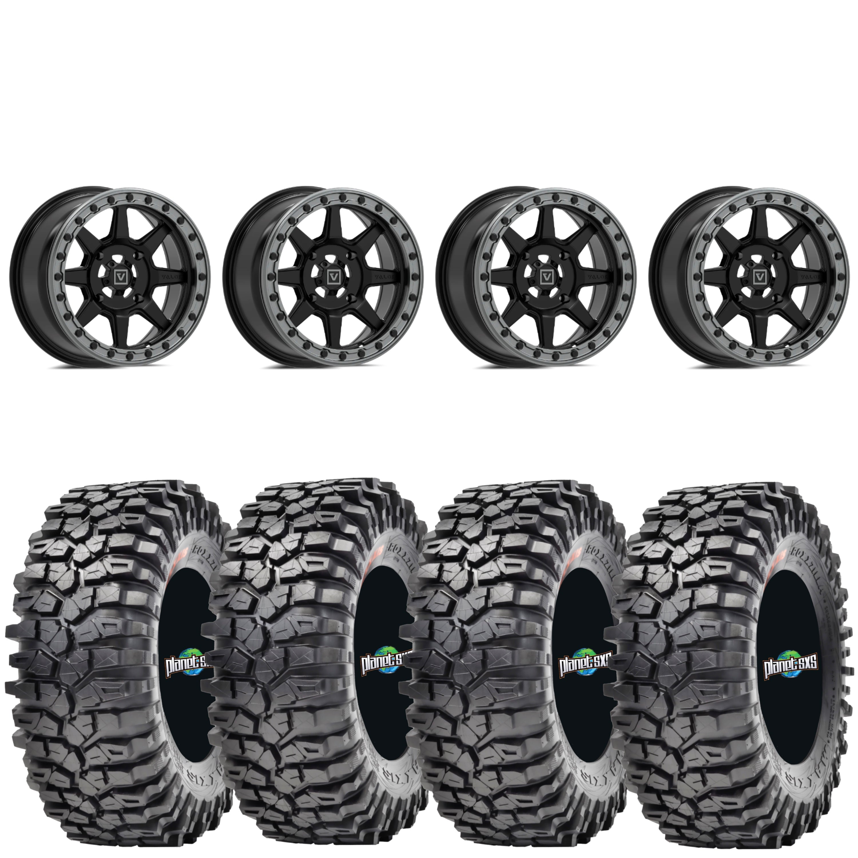 Valor V13 Satin Black Beadlock Wheels + Maxxis Roxxzilla Tires (Mounted Kit) – 15x7 | 5x4.5 Bolt Pattern | Fits RZR Pro R, Turbo R, Ranger 1500, Xpedition