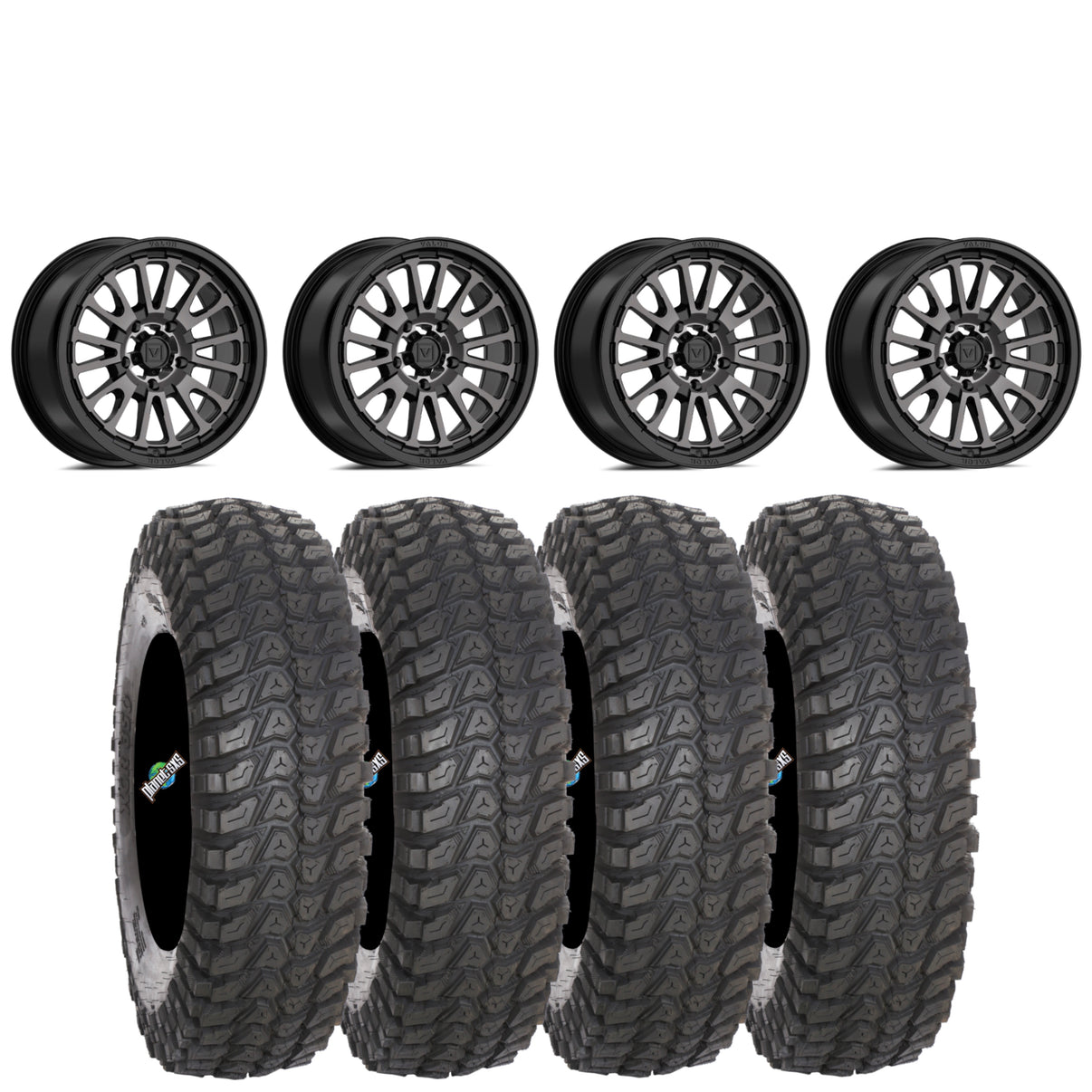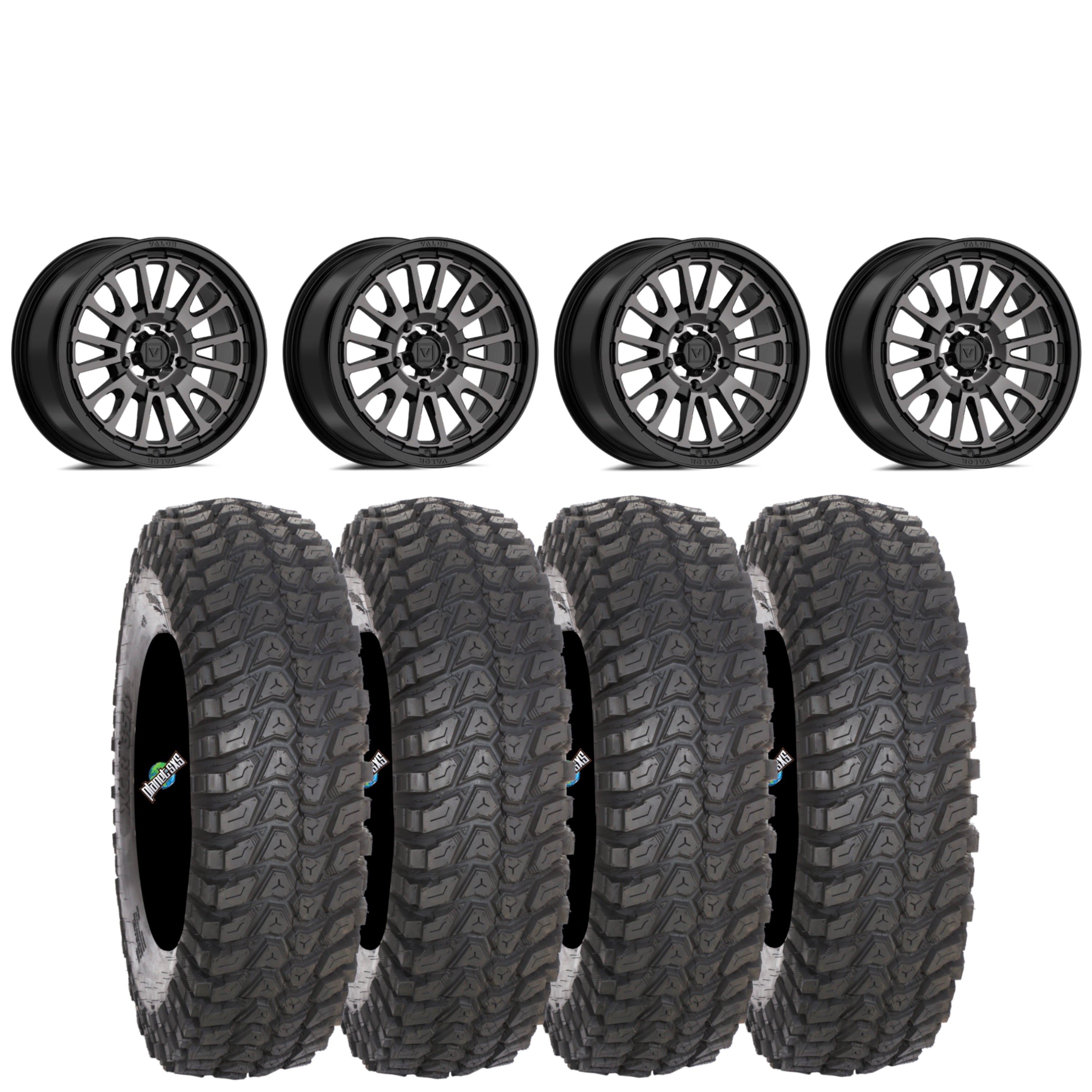 Get a set of (4) Valor Offroad V14 14x7/15x7 5+2 (+20mm) wheels mounted on 8-ply radial System 3 XCR350 tires with vehicle specific lug nuts.